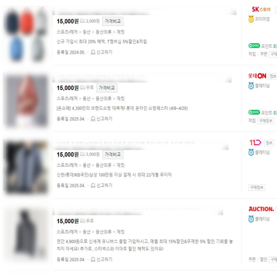 | 바람막이 자켓 | ₩15,000~₩25,000 | 방수·방풍 기능 포함 |