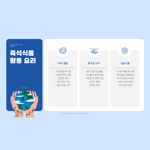 - 즉석 식품 (레토르트, MRE, 즉석밥): 불 없이 데우거나 그대로 먹을 수 있는 제품