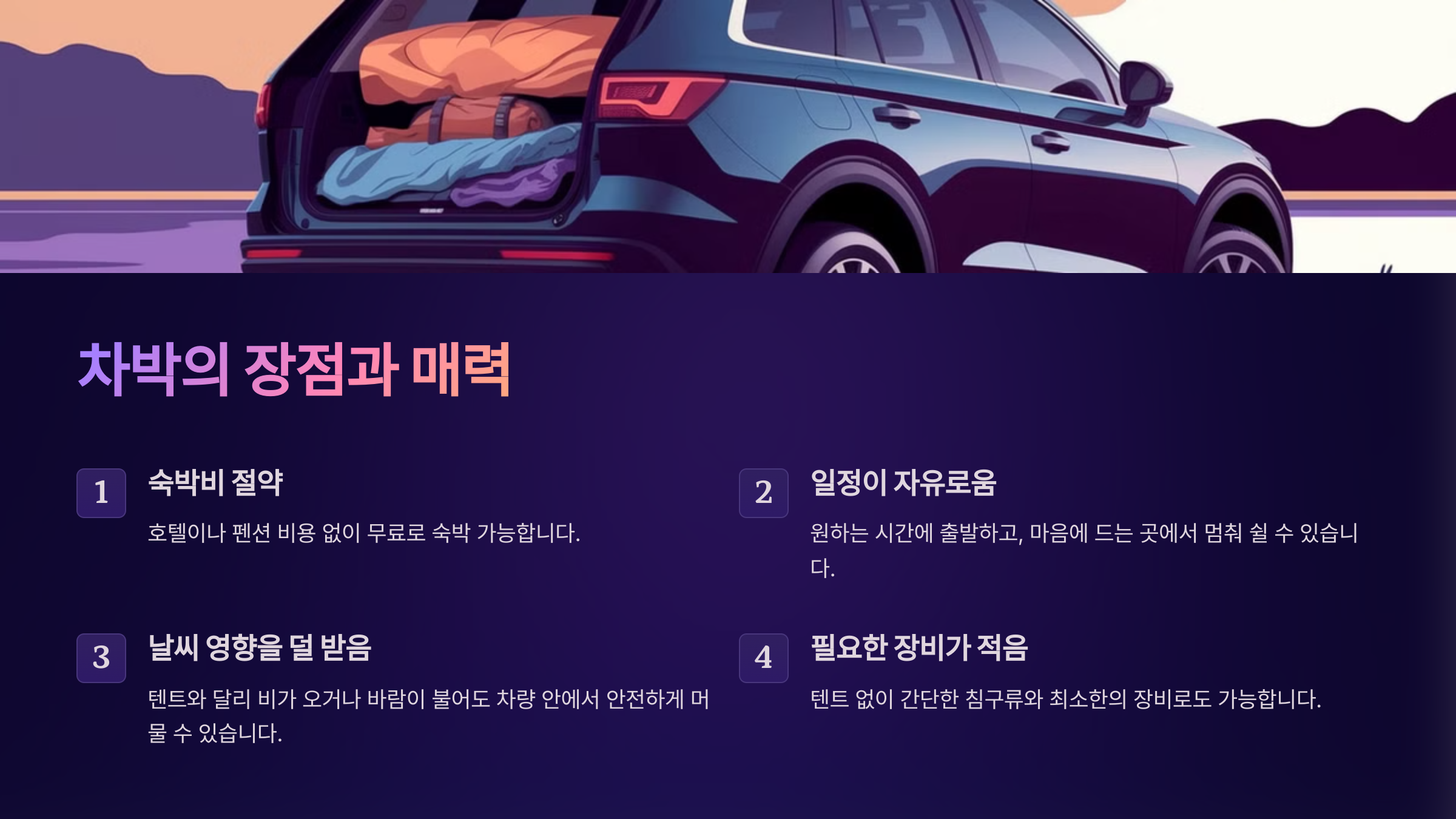 차박은 비용 부담 없이 자연을 즐길 수 있는 최고의 캠핑 방식이다. 올바른 장소를 선택하고, 기본적인 준비와 에티켓을 지킨다면 더욱 쾌적하고 즐거운 차박 경험이 가능하다.
