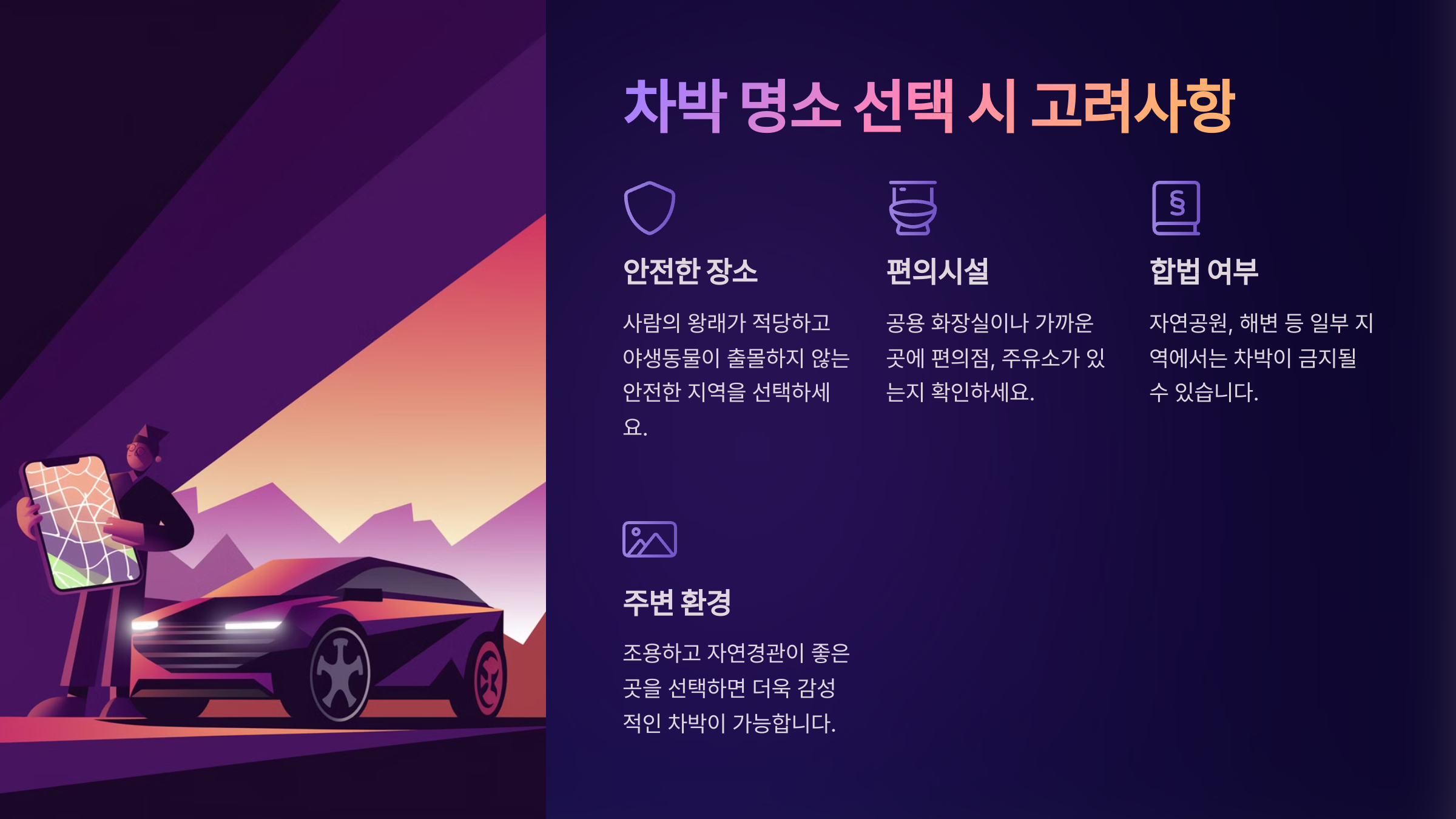 - 일부 해안가나 국립공원에서는 차박이 금지된 곳이 있으니 사전 확인이 필수다.