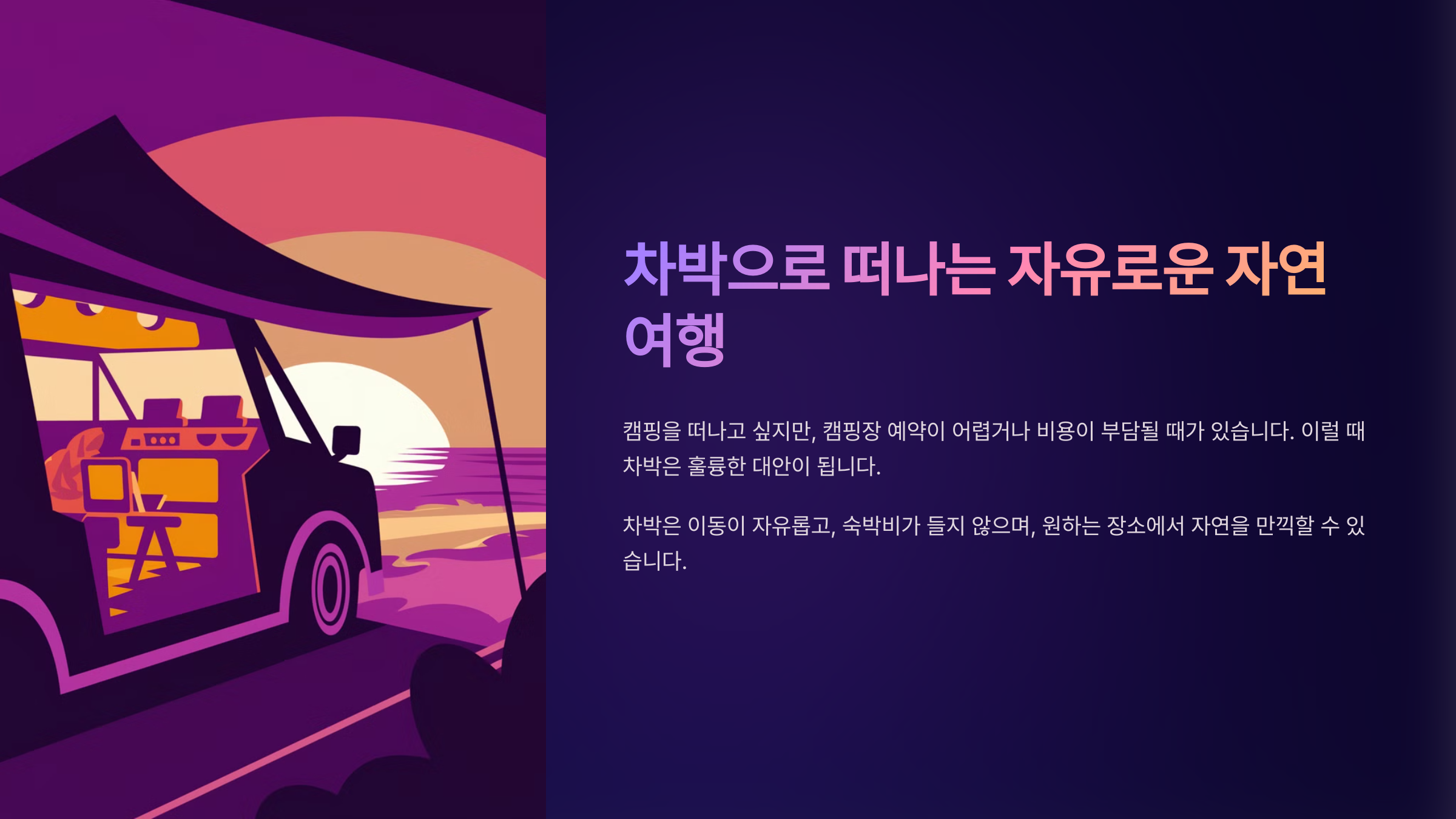 캠핑을 떠나고 싶지만, 캠핑장 예약이 어렵거나 비용이 부담될 때가 있다. 이럴 때 차박(차에서 숙박하는 캠핑 스타일) 은 훌륭한 대안이 될 수 있다. 차박은 이동이 자유롭고, 숙박비가 들지 않으며, 원하는 장소에서 자연을 만끽할 수 있다는 점에서 매력적이다.