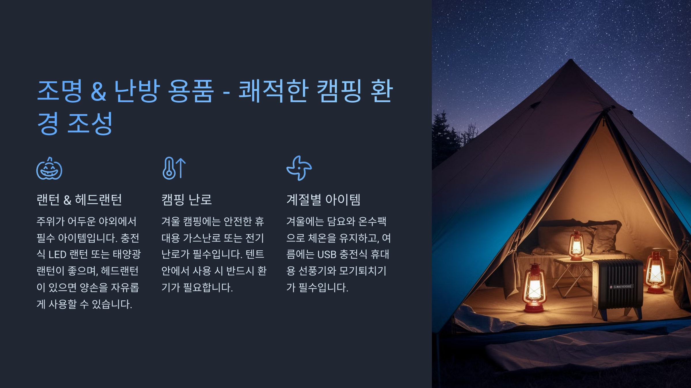 캠핑은 준비 과정이 번거로울 수 있지만, 올바른 장비 선택이 즐거운 캠핑 경험을 만드는 핵심이다.