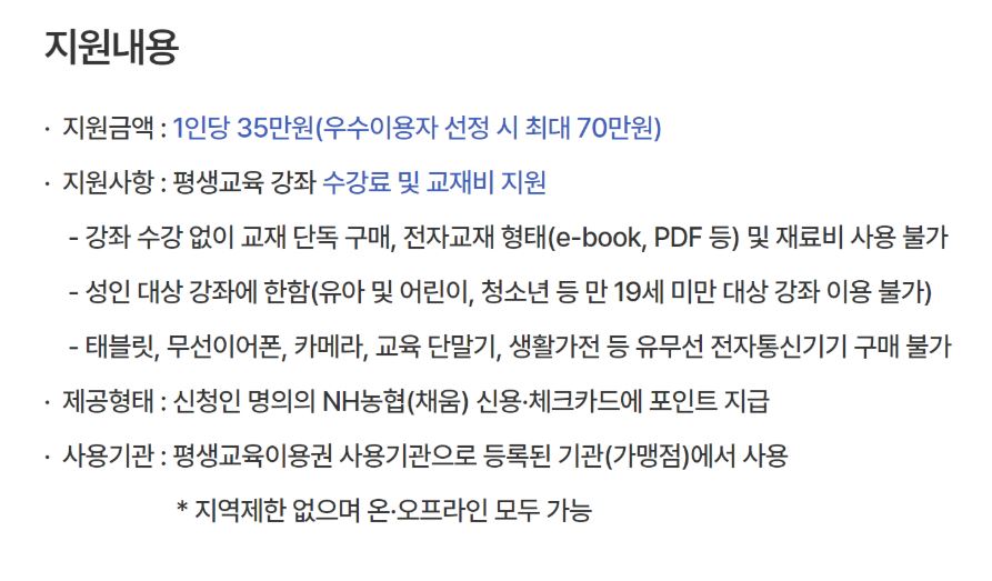 ✔️ 1인당 일정 금액의 교육비를 지원하여 평생교육기관에서 다양한 강좌를 수강할 수 있게 해주는 제도입니다.