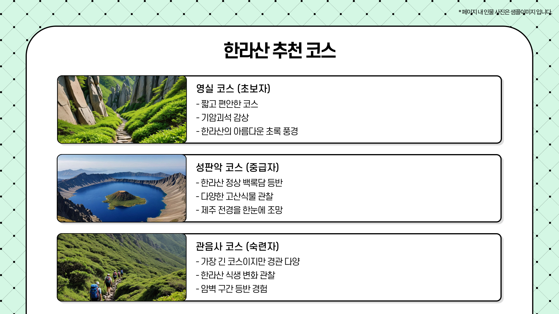 - 한라산의 고유한 자연경관과 다양한 식생을 관찰 가능.