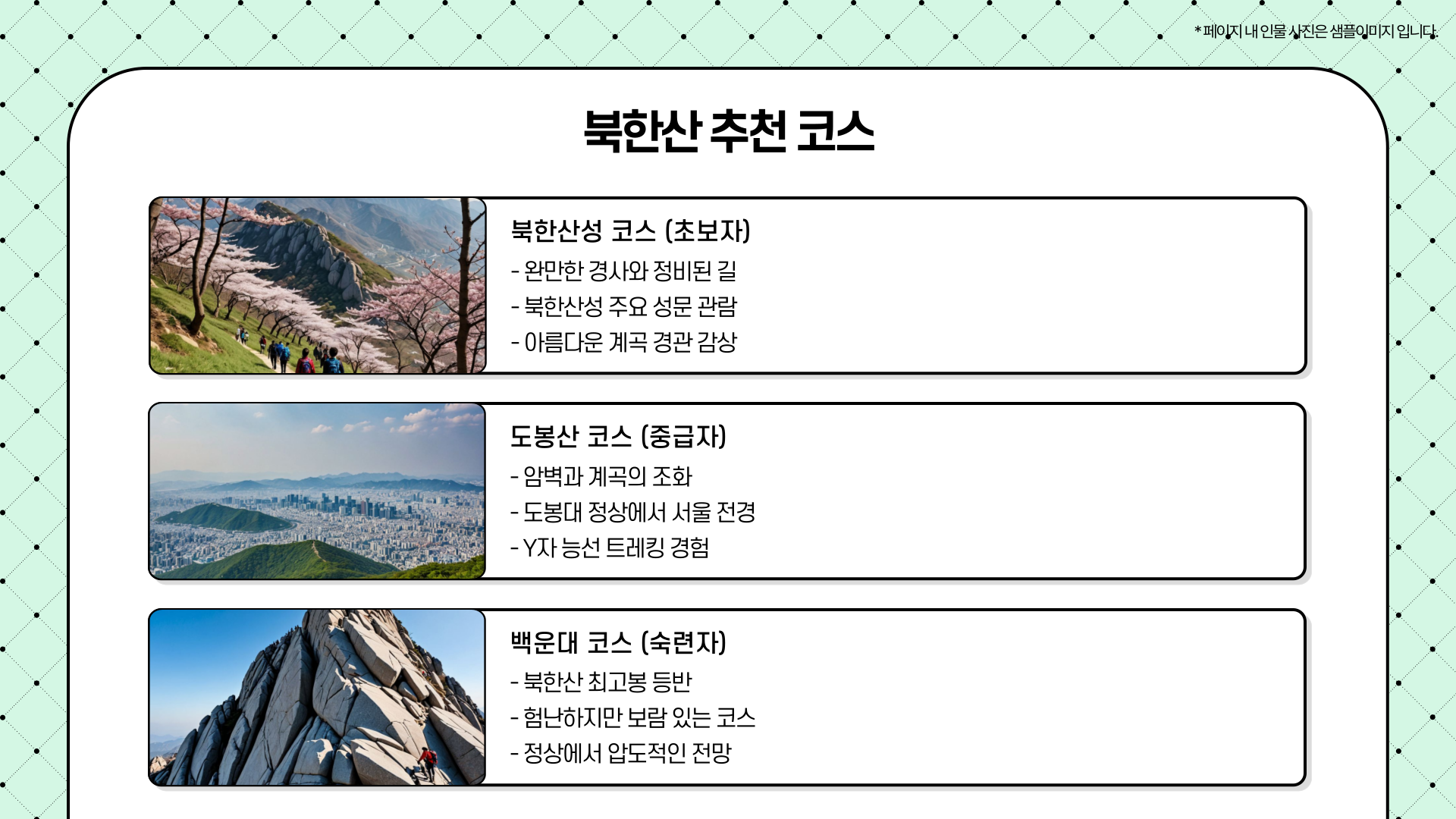 - 백운대 코스 (숙련자 추천): 북한산 최고봉으로, 다소 험난하지만 정상에서의 전망이 압권.