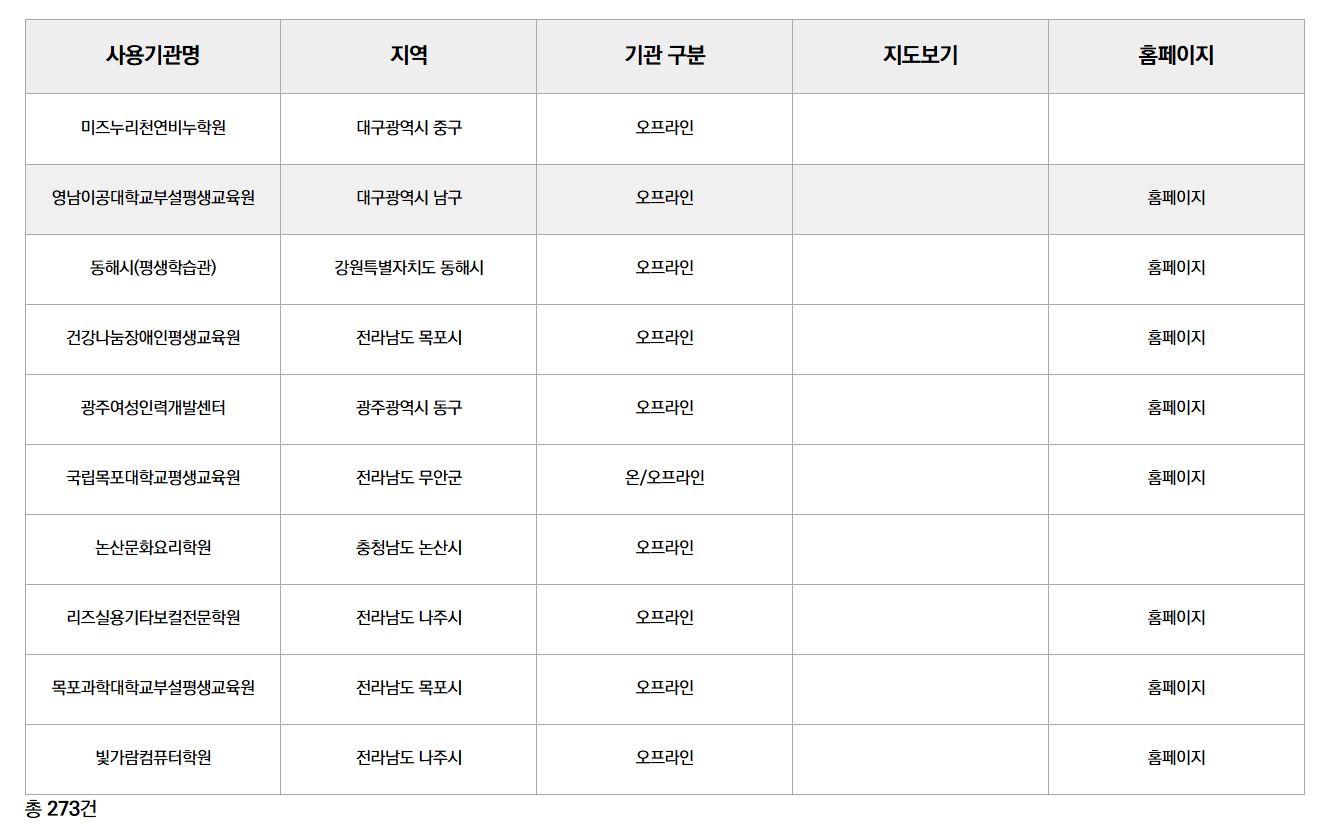 - 평생교육이용권 사용기관으로 등록된 기관(온/오프라인)에서 카드(NH농협 채움카드)를 결제하여 사용 가능