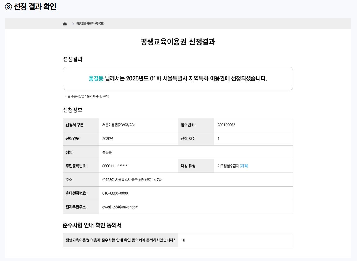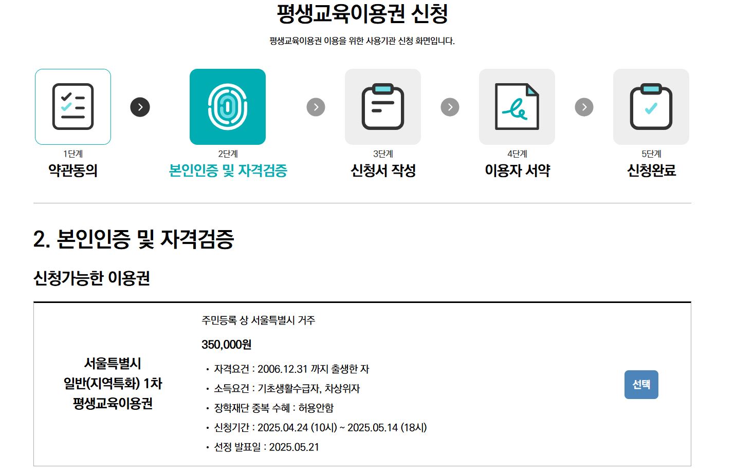 - 일반 평생교육이용권(1차) : 주민등록상 서울시에 주소를 둔 19세 이상 성인 중 기초생활수급자 및 차상위계층